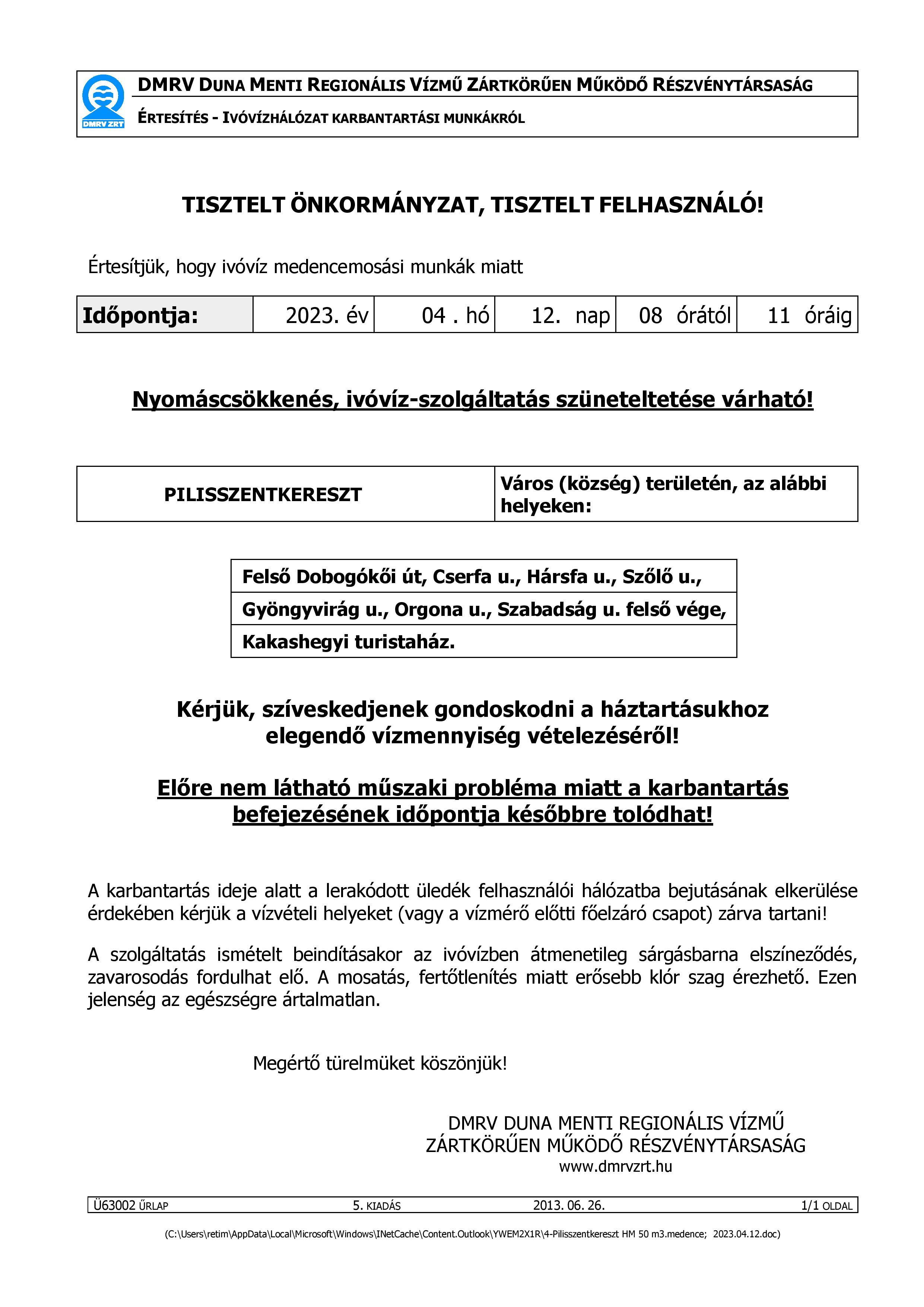 Ivóvíz-szolgáltatás szünetelése 2023.04.12.