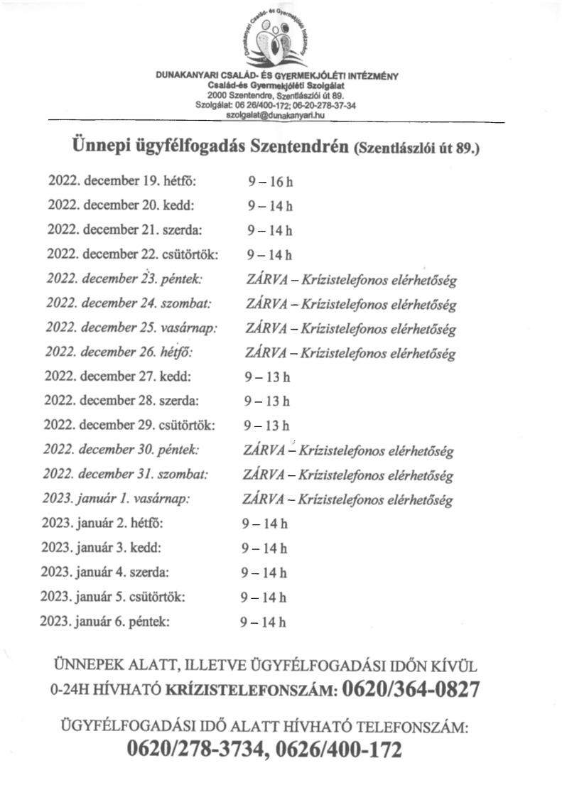Dunakanyari Család- és Gyermekjóléti Intézmény - Ünnepi ügyfélfogadás