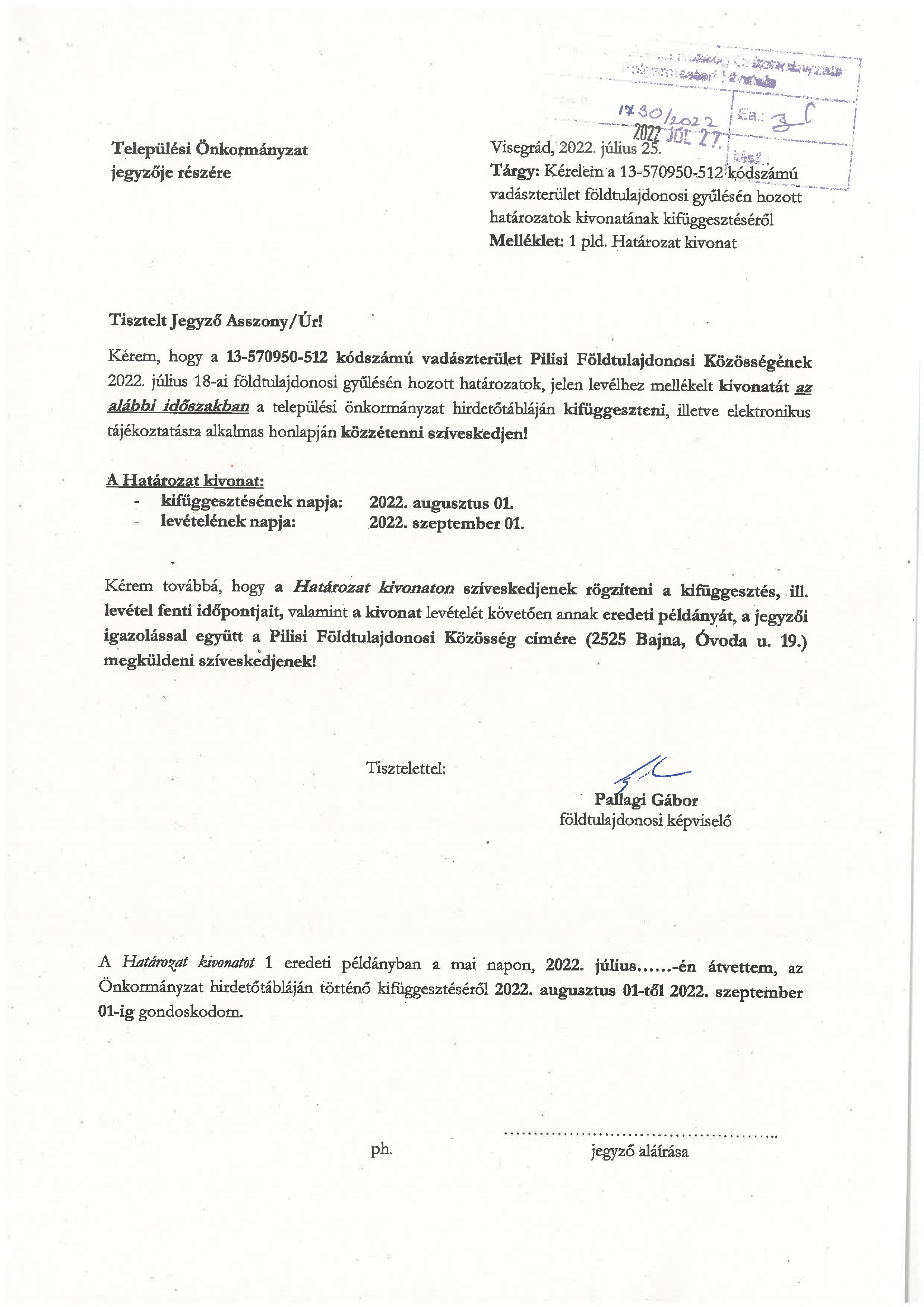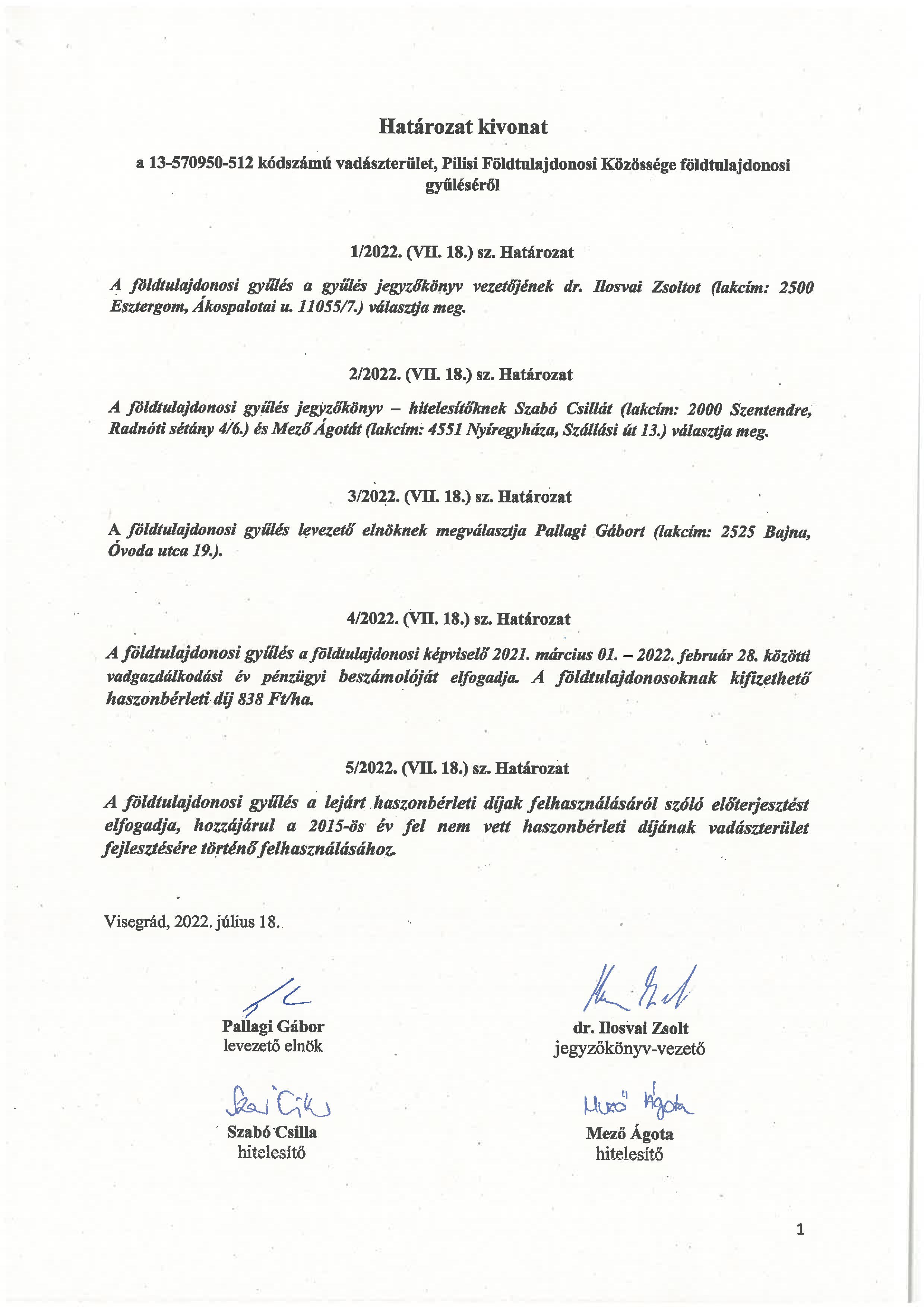 Kifüggesztés - Vadászterületek földtulajdonosi gyűlésén hozott határozatok kivonatai
