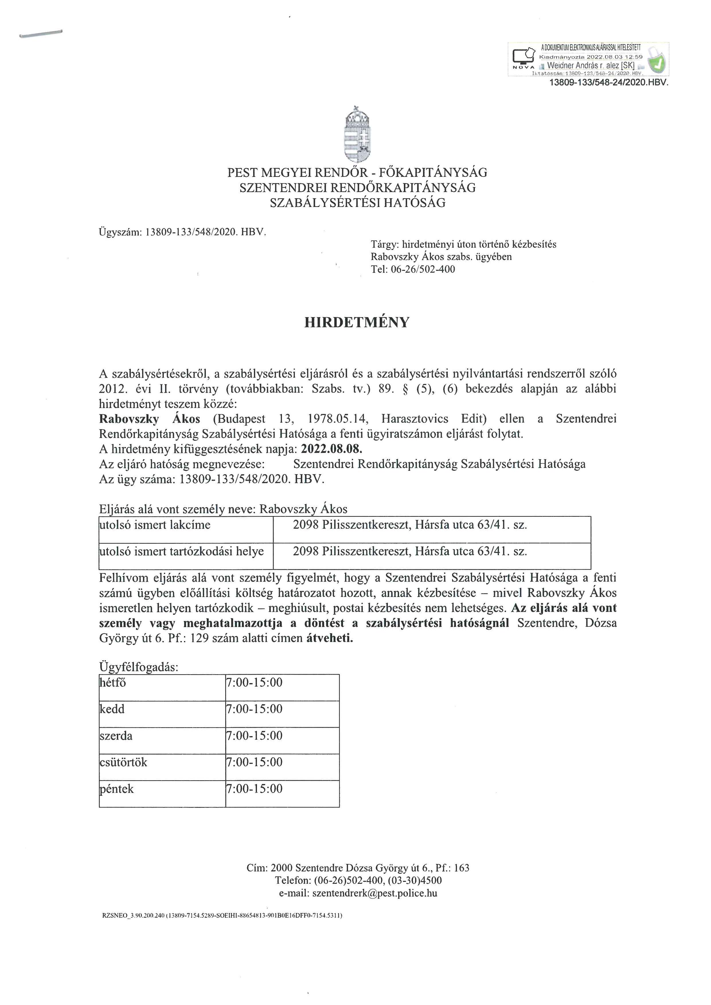 Rabovszky Ákos szabs. ügye - hirdetmény útján történő kézbesítés